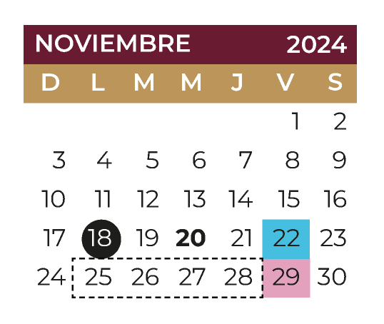 • Miércoles 20 de noviembre: Fecha en la que se recuerda la Revolución Mexicana, que será conmemorada en las escuelas.